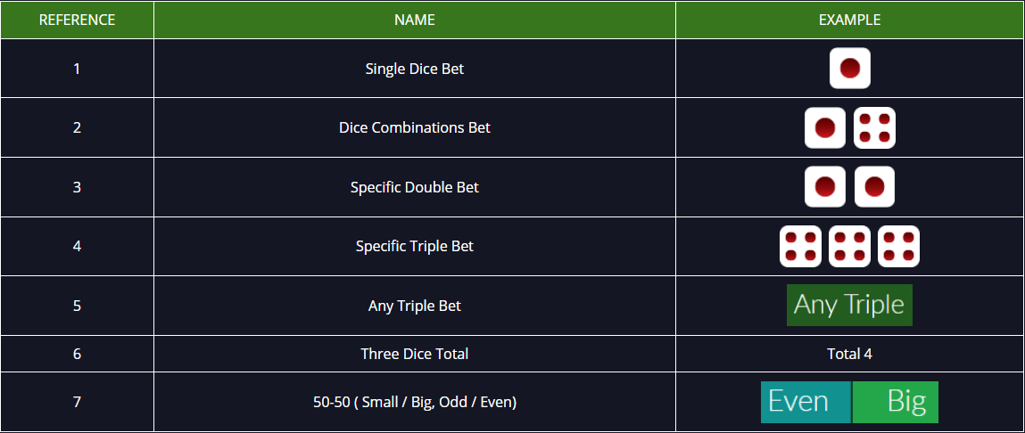 | Dice Combination Bet | 1:5 |